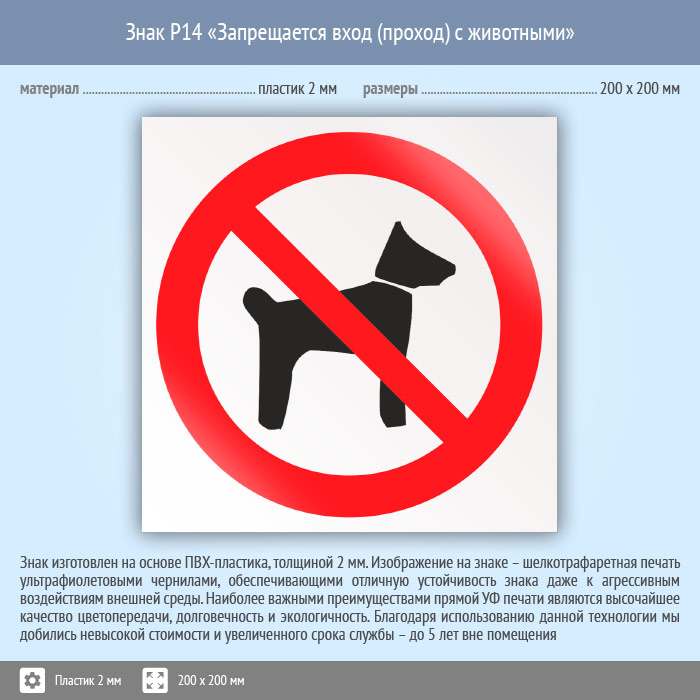 Знак P14 «Запрещается вход (проход) с животными» (пластик, 200х200 мм) в Омске купить