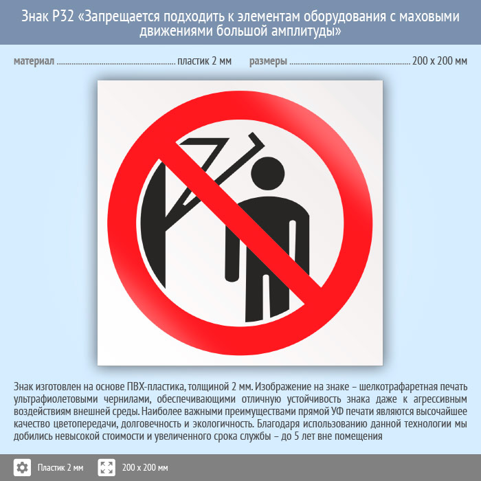 Знак P32 «Запрещается подходить к элементам оборудования с маховыми движениями большой амплитуды» (пластик, 200х200 мм) в Омске купить