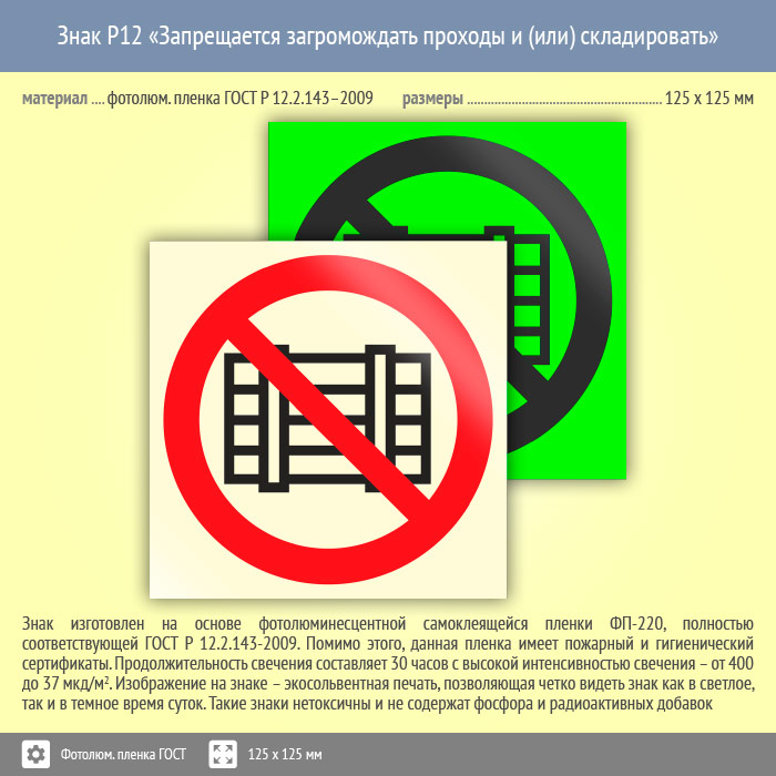 Знак P12 «Запрещается загромождать проходы и (или) складировать» (фотолюминесцентная пленка ГОСТ 34428-2018, 125х125 мм) в Омске купить