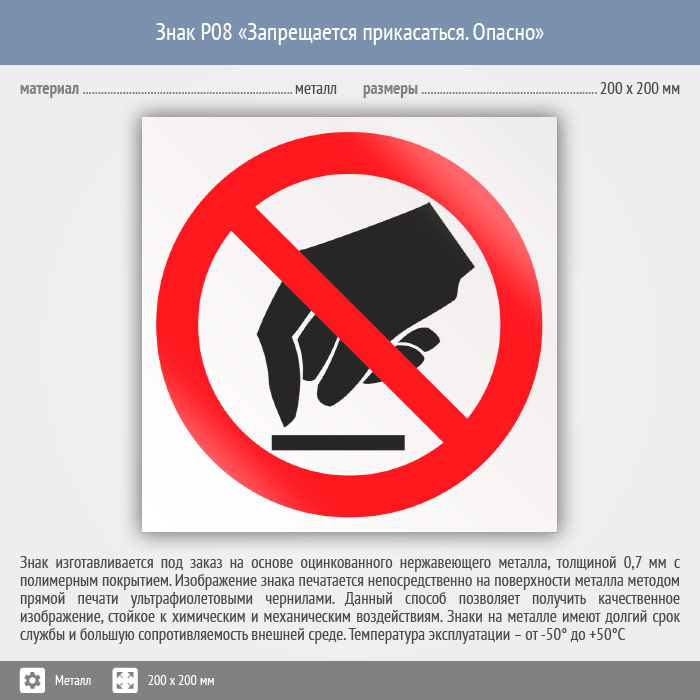 Знак P08 «Запрещается прикасаться. Опасно» (металл, 200х200 мм) в Омске купить