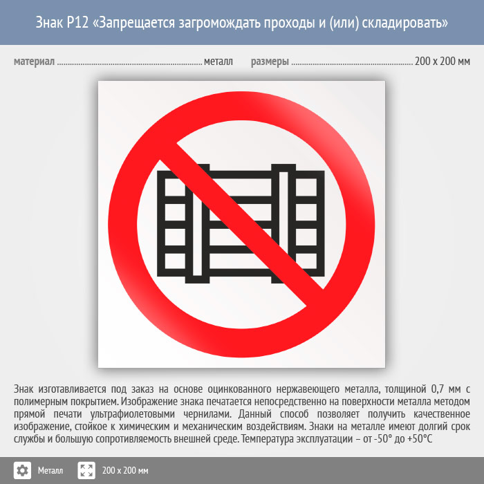 Знак P12 «Запрещается загромождать проходы и (или) складировать» (металл, 200х200 мм) в Омске купить