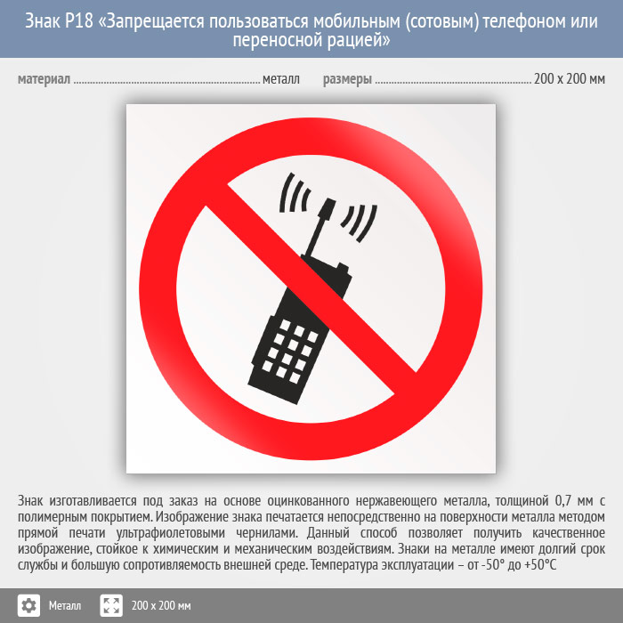 Знак P18 «Запрещается пользоваться мобильным (сотовым) телефоном или переносной рацией» (металл, 200х200 мм) в Омске купить