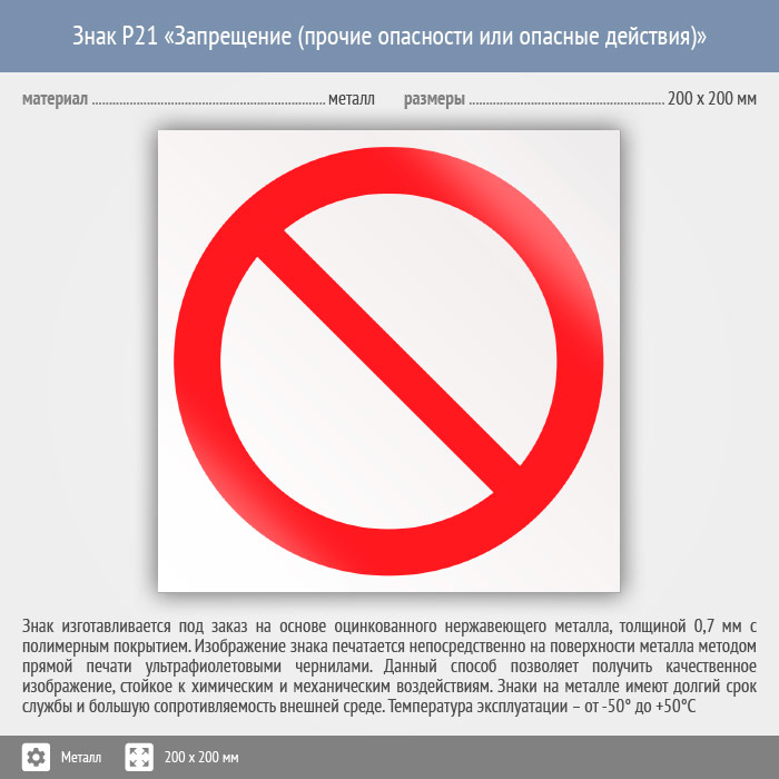 Знак P21 «запрещение (прочие опасности или опасные действия)» (металл, 200х200 мм) в Омске купить