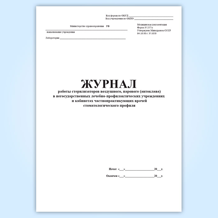 Журнал работы стерилизаторов воздушного, парового (автоклава) в негосударственных лечебно-профилактических учреждениях и кабинетах частнопрактикующих врачей стоматологического профиля (форма 257/у) в Омске купить