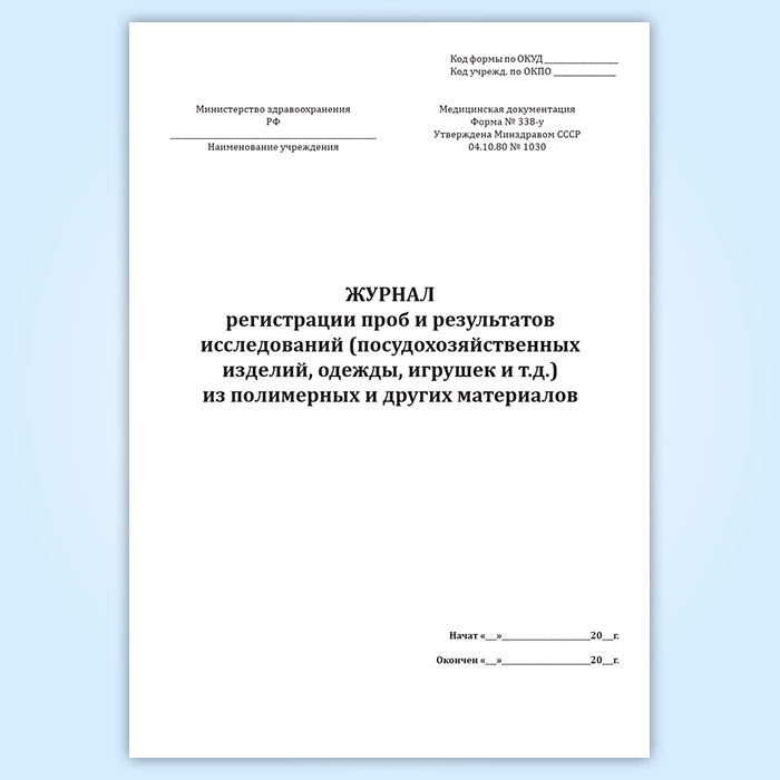 Журнал регистрации проб и результатов исследований (посудохозяйственных изделий, одежды, игрушек и т.д.) из полимерных и других материалов (форма № 338-у) в Омске купить