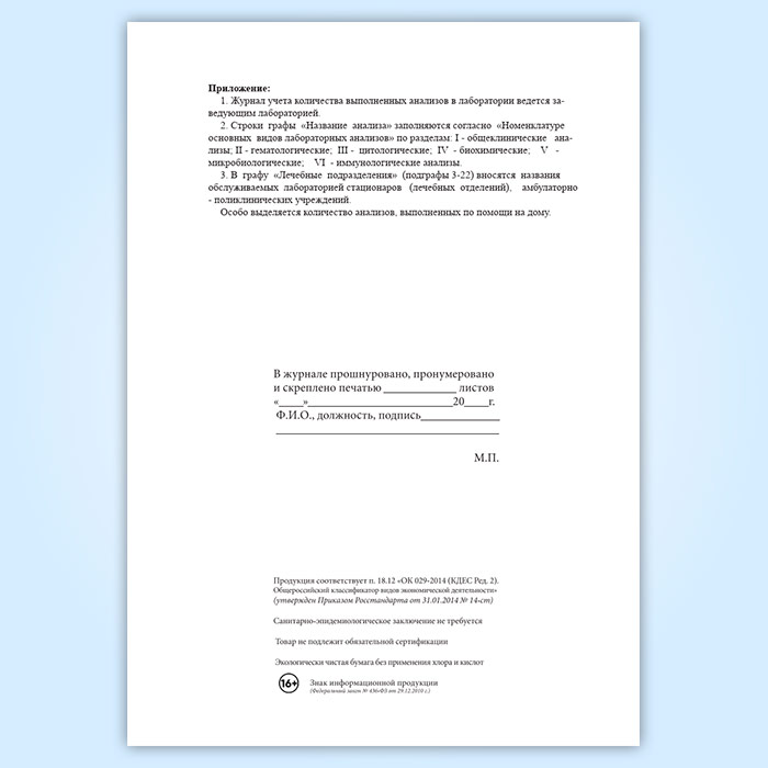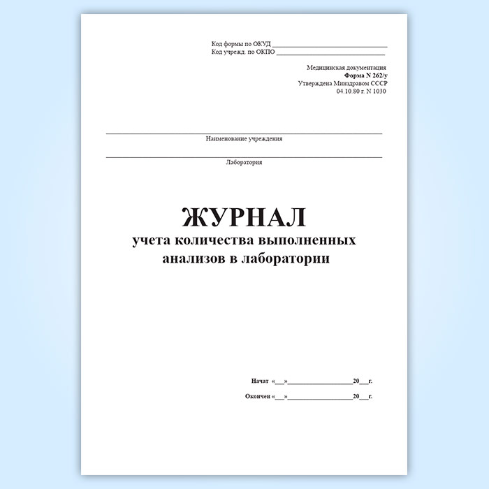 Журнал учета количества выполненных анализов в лаборатории (форма 262/у) в Омске купить