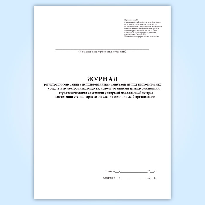 Журнал регистрации операций с использованными ампулами из-под наркотических средств и психотропных веществ, использованными трансдермальными терапевтическими системами у старшей медицинской сестры в отделении стационарного отделения медицинской организации в Омске купить
