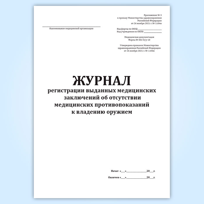 Журнал регистрации выданных медицинских заключений об отсутствии медицинских противопоказаний к владению оружием (форма 002-О/У-10) в Омске купить