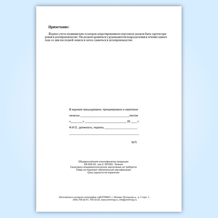 Журнал учета медицинских осмотров декретированного персонала в Омске купить