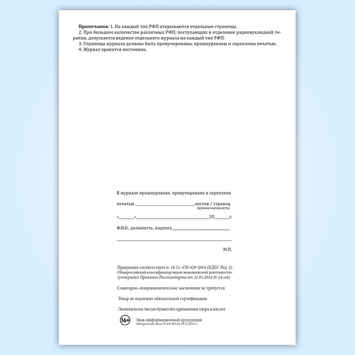 Приходно-расходный журнал учета радиофармпрепаратов, поступающих в подразделение радионуклидной терапии в готовом виде для непосредственного введения в организм пациента в Омске купить