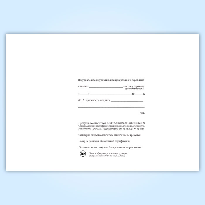 Вы получаете печатную продукцию прошнурованной и c местом для вашей печати в соответствии с действующими нормативными документами: