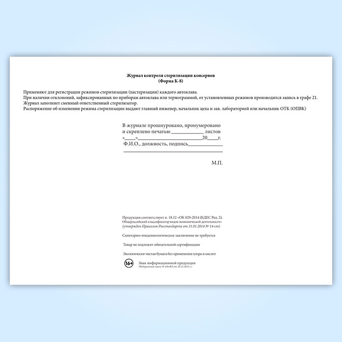Журнал контроля стерилизации консервов (форма К-8) в Омске купить