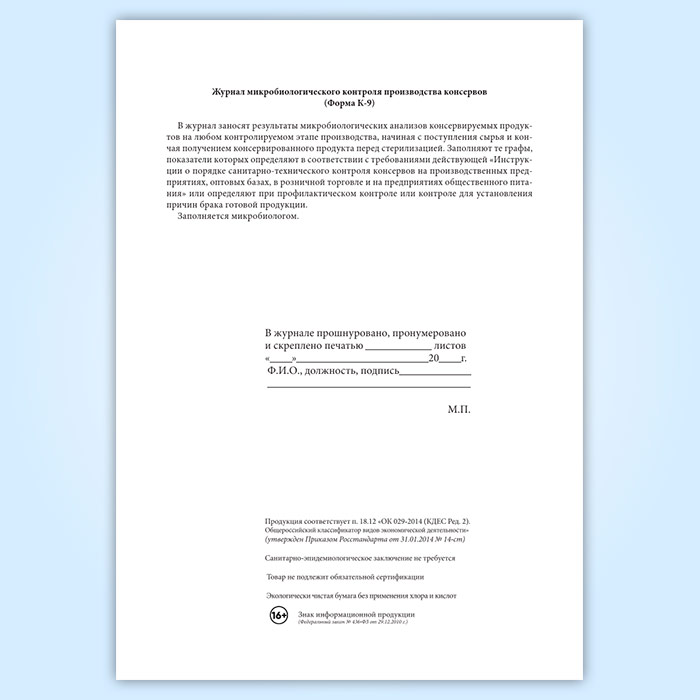 Журнал микробиологического контроля производства консервов (форма К-9) в Омске купить