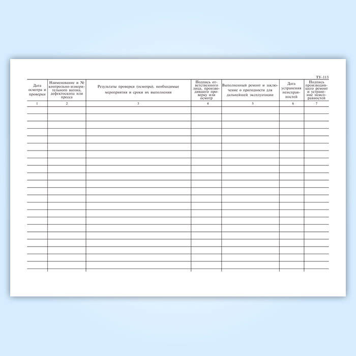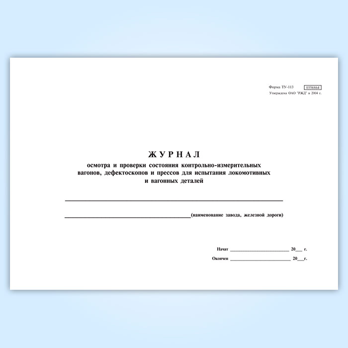 Журнал осмотра и проверки состояния контрольно-измерительных вагонов, дефектоскопов и прессов для испытания локомотивных и вагонных деталей (форма ТУ-113) в Омске купить