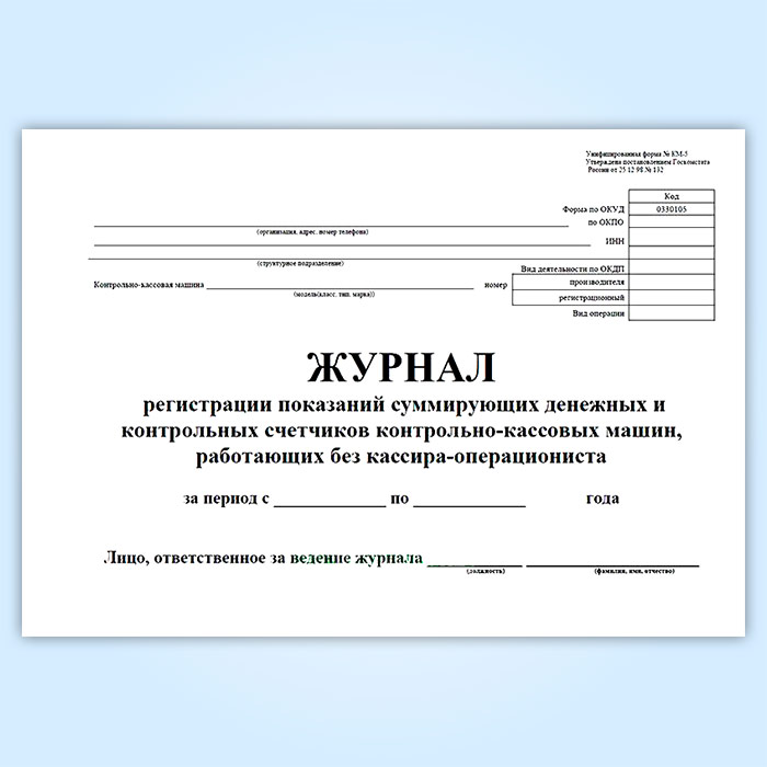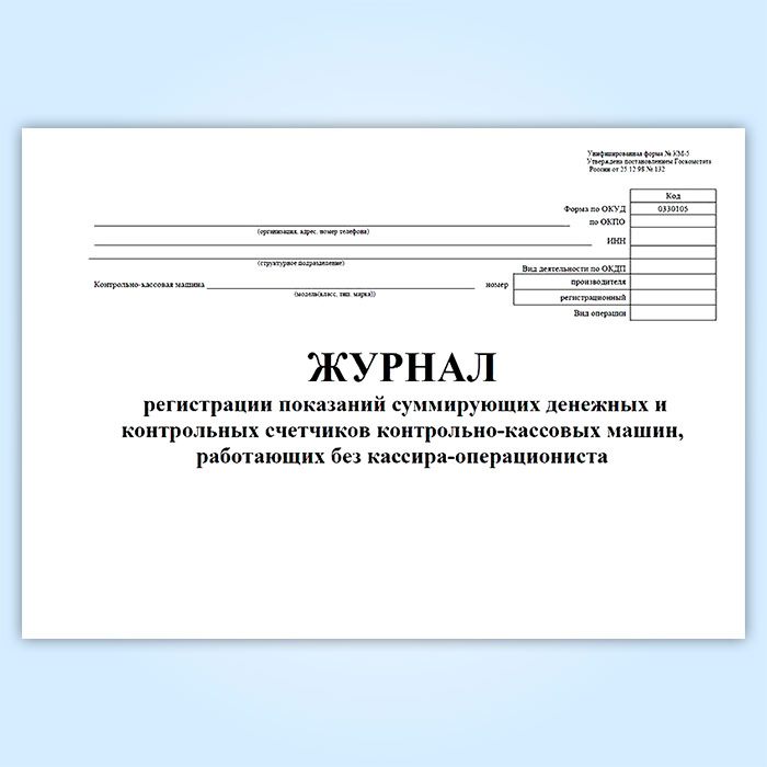 Журнал регистрации показаний суммирующих денежных и контрольных счетчиков контрольно-кассовых машин, работающих без кассира-операциониста (форма КМ-5) в Омске купить
