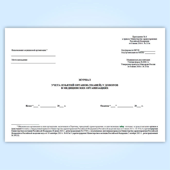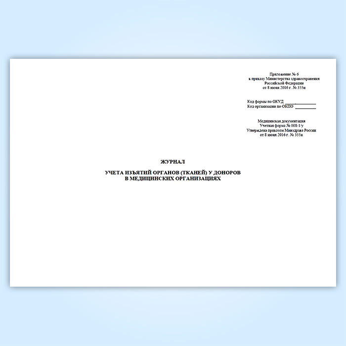 Журнал учета изъятий органов (тканей) у доноров в медицинских организациях (форма № 008-1/у) в Омске купить