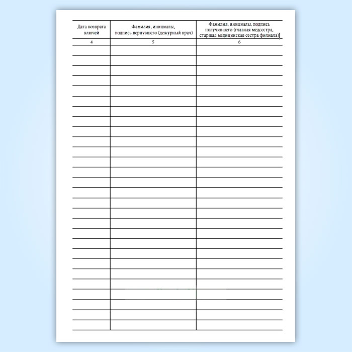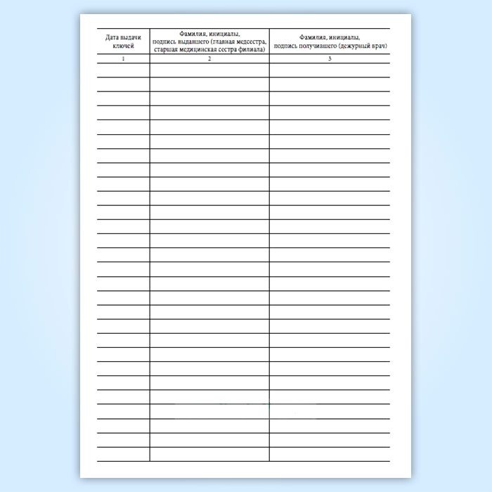 Журнал передачи ключей главной медсестры (старшей медицинской сестры филиала) дежурным врачам от помещения и сейфа, где проводятся операции, связанные с оборотом наркотических средств и психотропных веществ, в выходные и праздничные дни в амбулаторном отделении медицинской организации в Омске купить