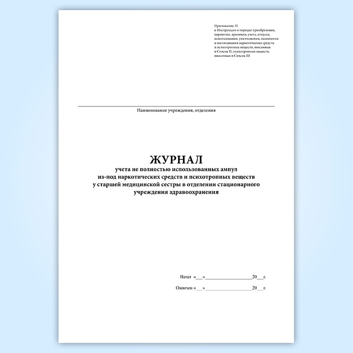 Журнал учета не полностью использованных ампул из-под наркотических средств и психотропных веществ у старшей медицинской сестры в отделении стационарного учреждения здравоохранения в Омске купить