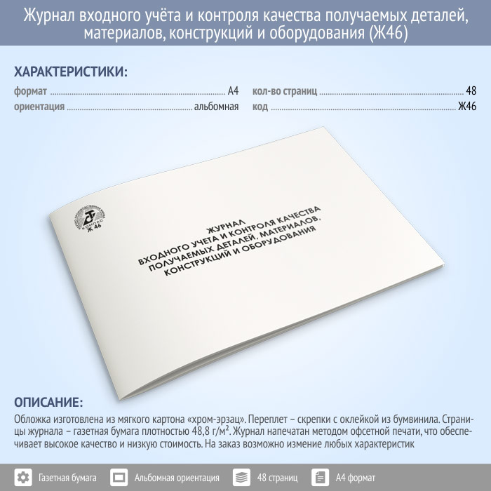 Журнал входного учета и контроля качества получаемых деталей, материалов, конструкций и оборудования (48 стр., Ж46) в Омске купить