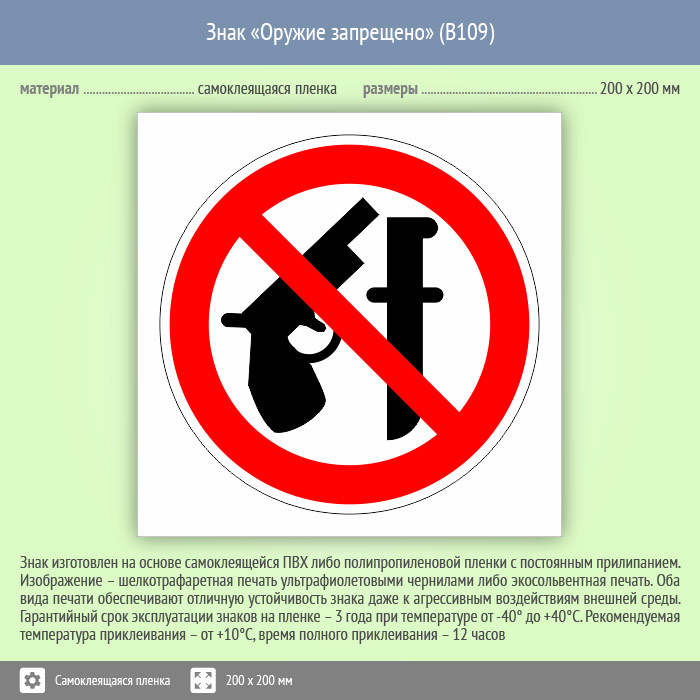 Знак (табличка) «Оружие запрещено» имеет размер(ы): 200х200 мм, но может быть изготовлен(а) любого размера на самоклеящейся пленке, пластике толщиной 0.5, 2 или 4 мм и металле. Также возможно применение фотолюминесцентных и световозвращающих материалов