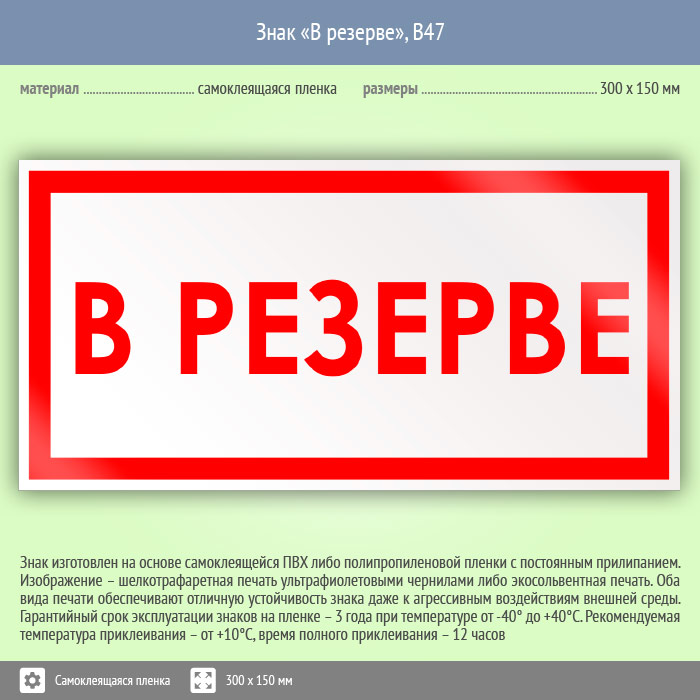 Знак «В резерве» может быть изготовлен любого размера на самоклеящейся пленке, пластике толщиной 0.5, 2 или 4 мм и металле. Также возможно применение фотолюминесцентных и световозвращающих материалов