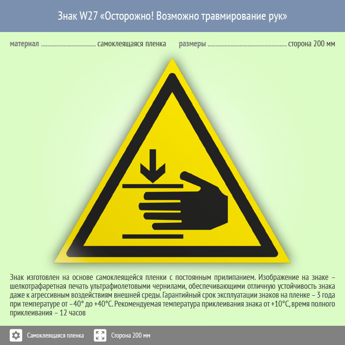 Знак «Осторожно! Возможно травмирование рук» предупреждает травматизм рук при работе на данном оборудовании. Код знака: W27