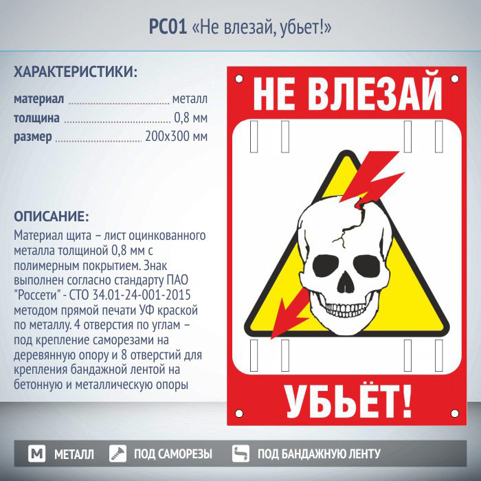 Знак «Не влезай, убьет!», РС01 (металл, 200х300 мм, отверстия под бандажную ленту) в Омске купить