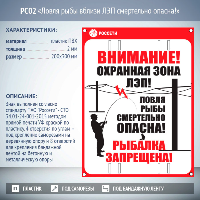 Знак «Ловля рыбы вблизи ЛЭП смертельно опасна!», РС02 (пластик 2 мм, 200х300 мм, отверстия под бандажную ленту) в Омске купить