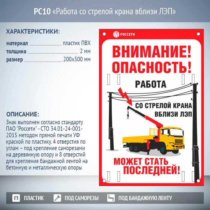 Знак «Работа со стрелой крана вблизи ЛЭП», РС10 (пластик 2 мм, 200х300 мм, отверстия под бандажную ленту) в Омске купить