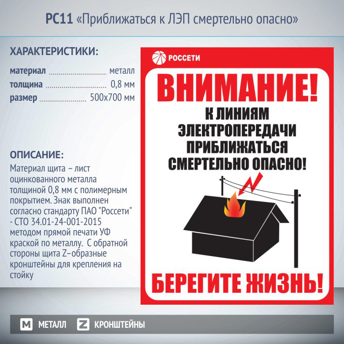 Информационный щит «Приближаться к ЛЭП смертельно опасно», РС11 (металл, 500х700 мм, кронштейны для крепления) в Омске купить