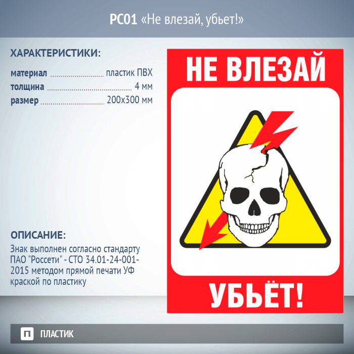 Знак «Не влезай, убьет!», РС01 (пластик 2 мм, 200х300 мм) в Омске купить