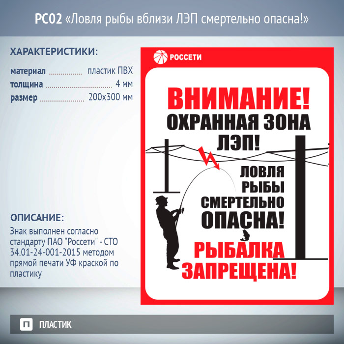 Знак «Ловля рыбы вблизи ЛЭП смертельно опасна!», РС02 (пластик 2 мм, 200х300 мм) в Омске купить