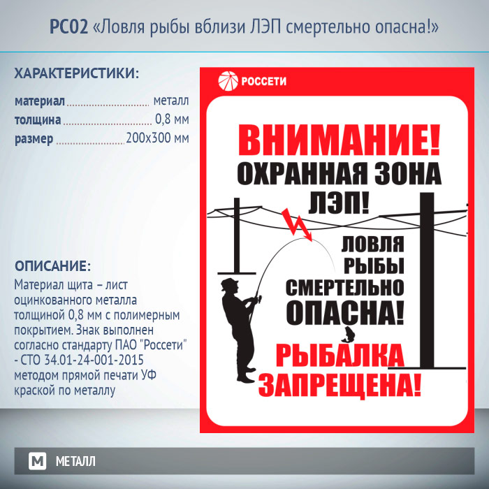 Знак «Ловля рыбы вблизи ЛЭП смертельно опасна!», РС02 (металл, 200х300 мм) в Омске купить