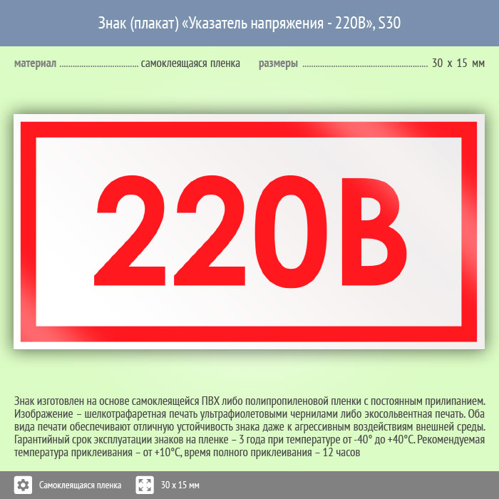 Знак (плакат) «Указатель напряжения - 220В», S30 (50 штук, пленка, 30х15 мм) в Омске купить