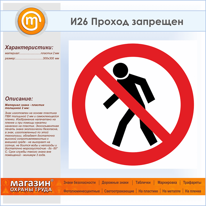 Знак «Проход запрещен», И26 (пластик, 300х300 мм) в Омске купить