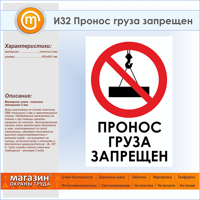 Знак «Пронос груза запрещен», И32 (пластик, 400х600 мм) в Омске купить