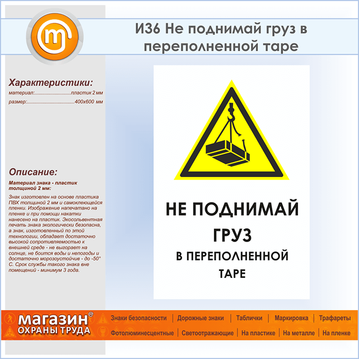 Знак «Не поднимай груз в переполненной таре», И36 (пластик, 400х600 мм) в Омске купить