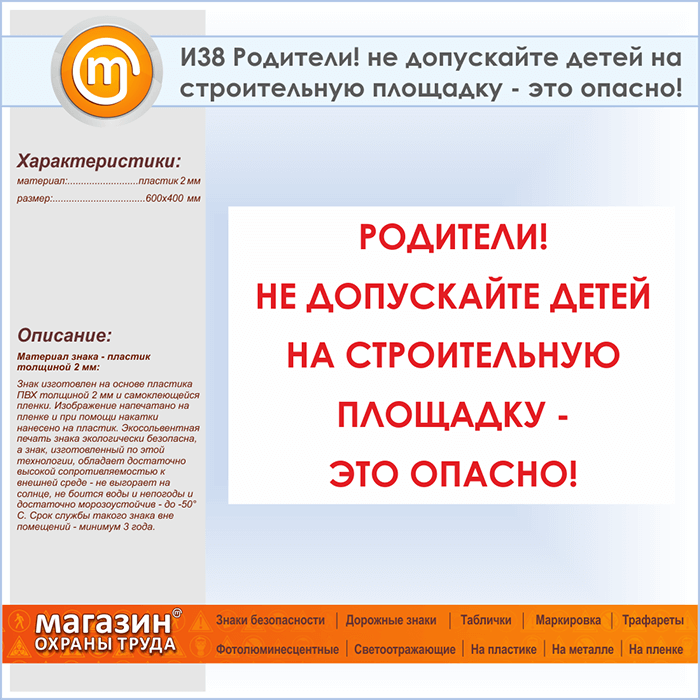 Знак «Родители! не допускайте детей на строительную площадку - это опасно!», И38 (пластик, 600х400 мм) в Омске купить