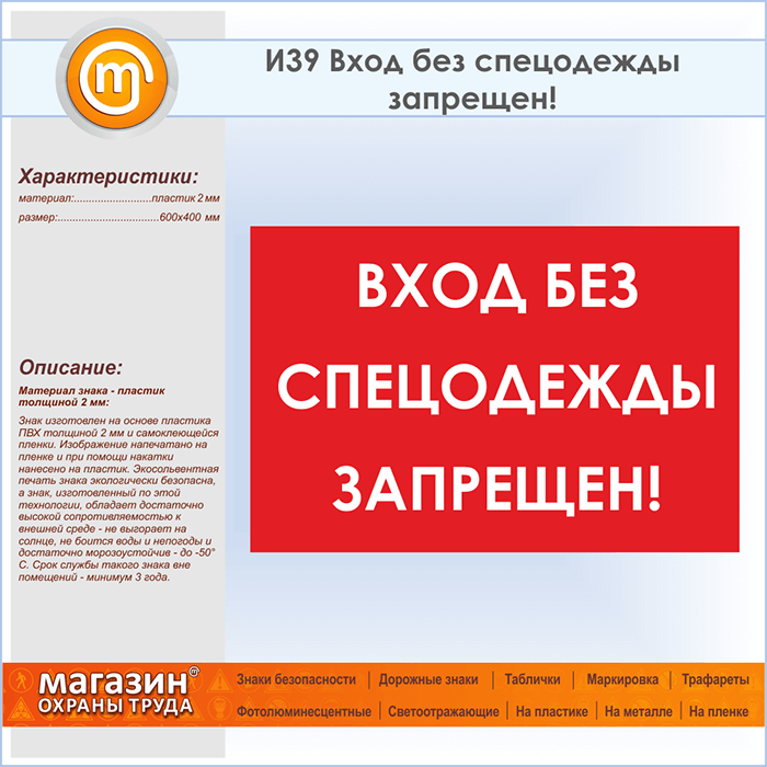 Знак «Вход без спецодежды запрещен!», И39 (пластик, 600х400 мм) в Омске купить