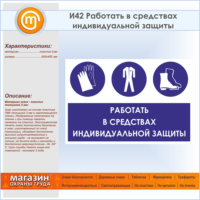 Знак «Работать в средствах индивидуальной защиты», И42 (пластик, 600х400 мм) в Омске купить