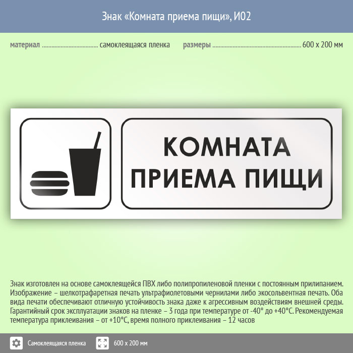 Знак «Комната приема пищи», И02 (пленка, 600х200 мм) в Омске купить