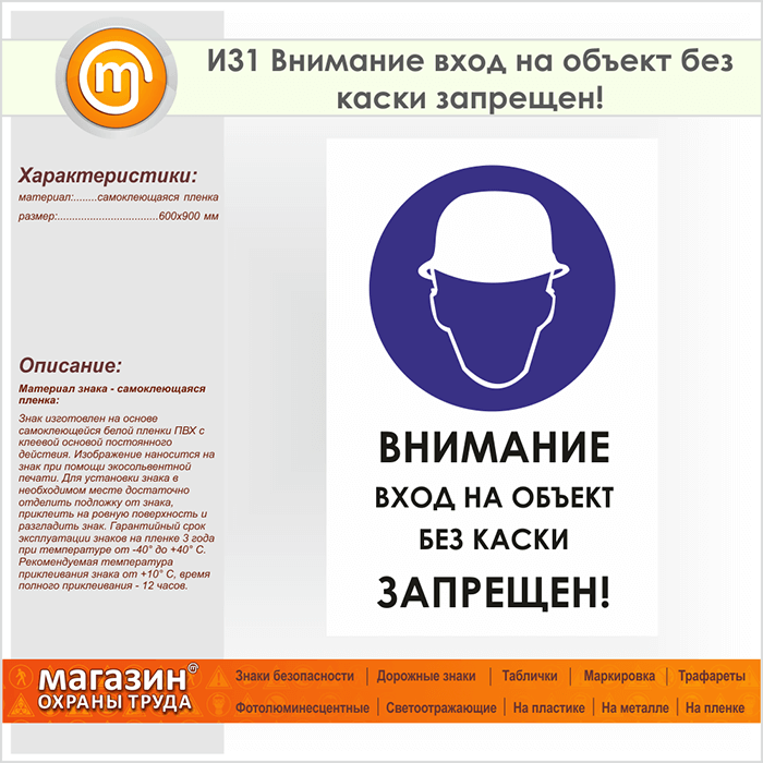 Знак «Внимание вход на объект без каски запрещен!», И31 (пленка, 600х900 мм) в Омске купить