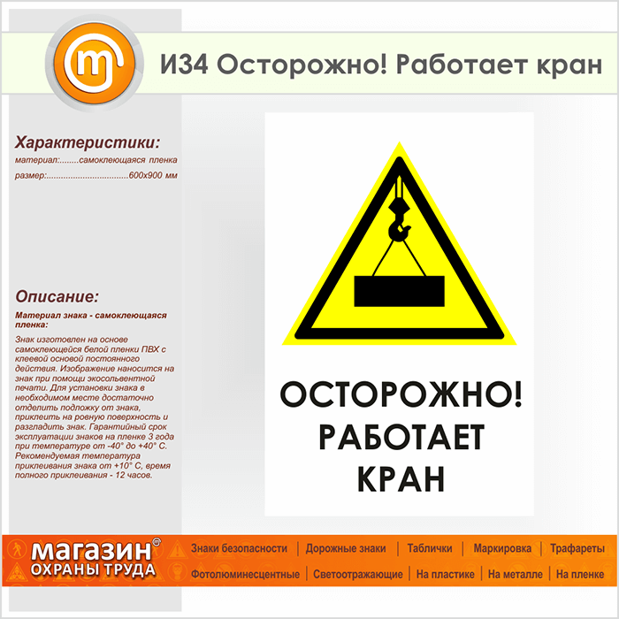Знак «Осторожно! Работает кран», И34 (пленка, 600х900 мм) в Омске купить