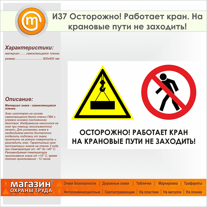 Знак «Осторожно! Работает кран. На крановые пути не заходить!», И37 (пленка, 900х600 мм) в Омске купить
