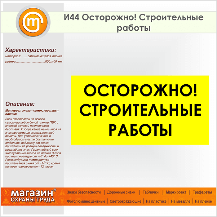 Знак «Осторожно! Строительные работы», И44 (пленка, 800х400 мм) в Омске купить