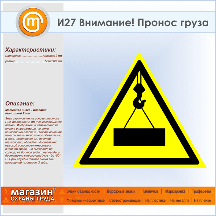 Знак «Внимание! Пронос груза», И27 (пластик, сторона 500 мм) в Омске купить