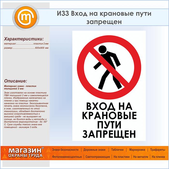 Знак «Вход на крановые пути запрещен», И33 (пластик, 600х900 мм) в Омске купить