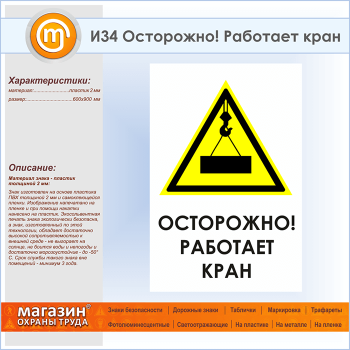 Знак «Осторожно! Работает кран», И34 (пластик, 600х900 мм) в Омске купить