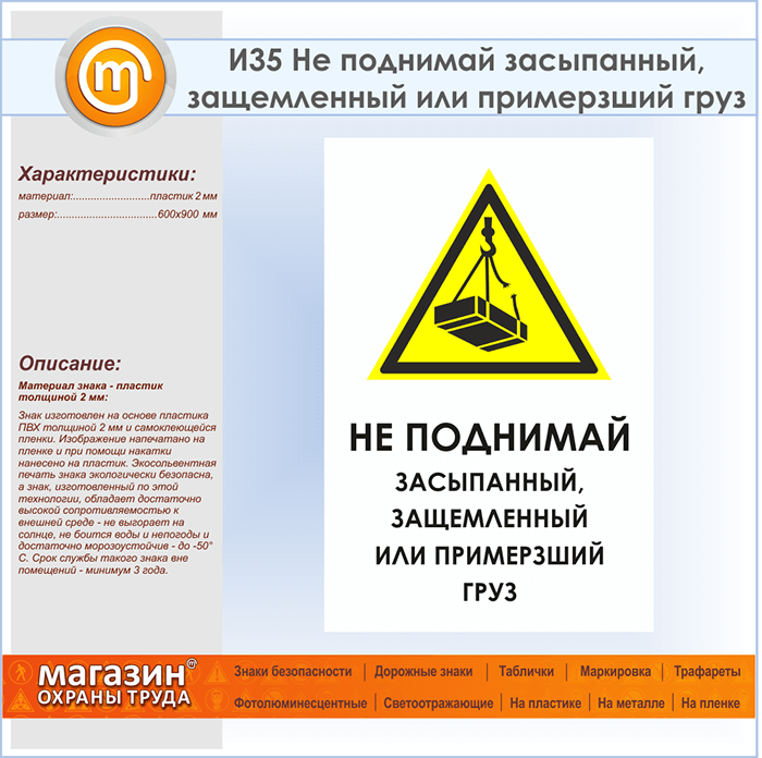 Знак «Не поднимай засыпанный, защемленный или примерзший груз», И35 (пластик, 600х900 мм) в Омске купить