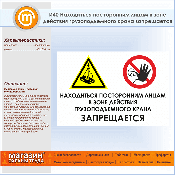 Знак «Находиться посторонним лицам в зоне действия грузоподъемного крана запрещается», И40 (пластик, 900х600 мм) в Омске купить